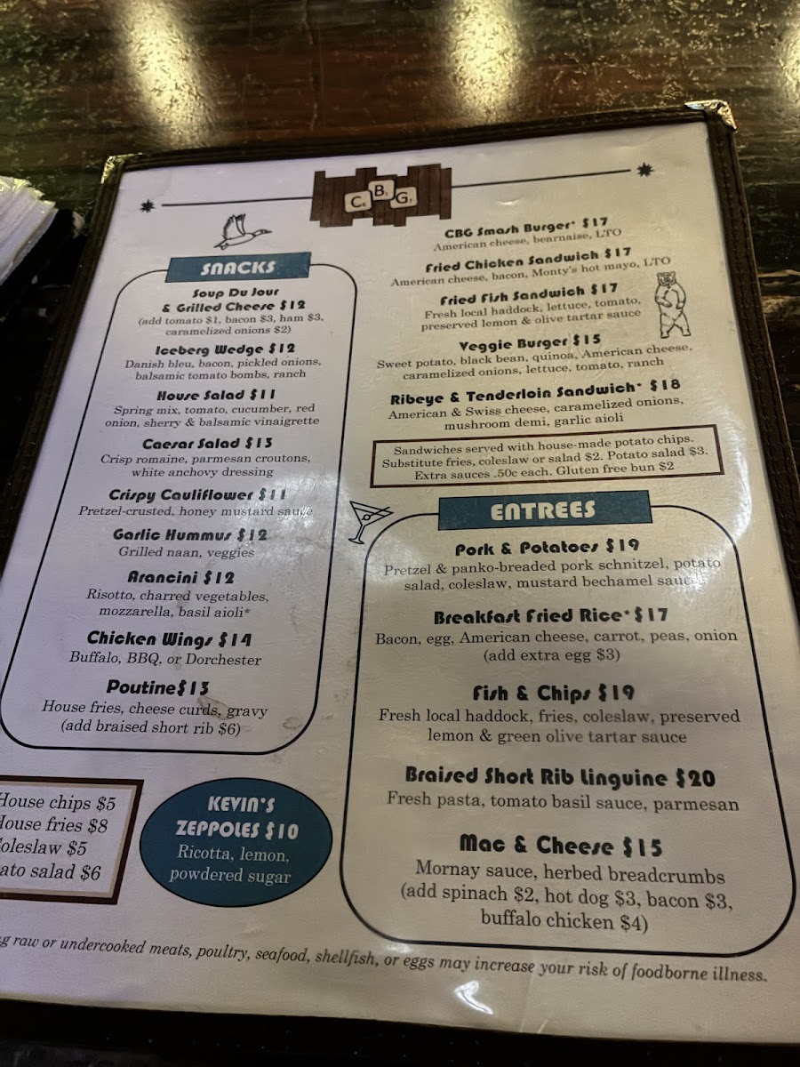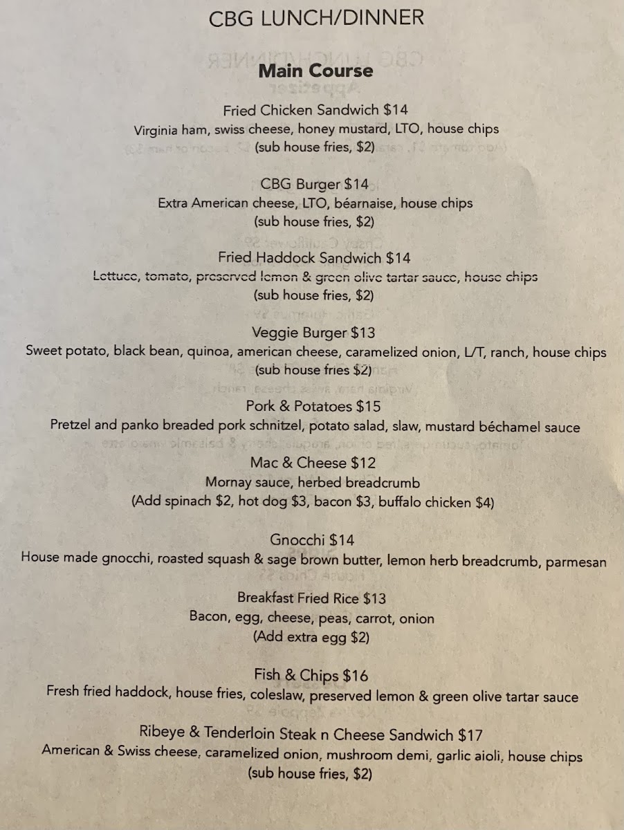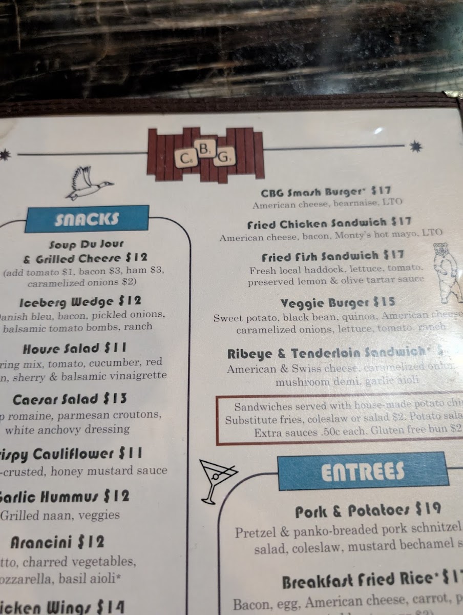 The menu at CBG offers a balanced selection of approachable bar and grill fare, perfect for relaxed afternoons or lively evenings in downtown Portland. The focus is on comforting, well-crafted dishes with familiar ingredients given thoughtful twists, making it easy to find both casual bites and satisfying meals.