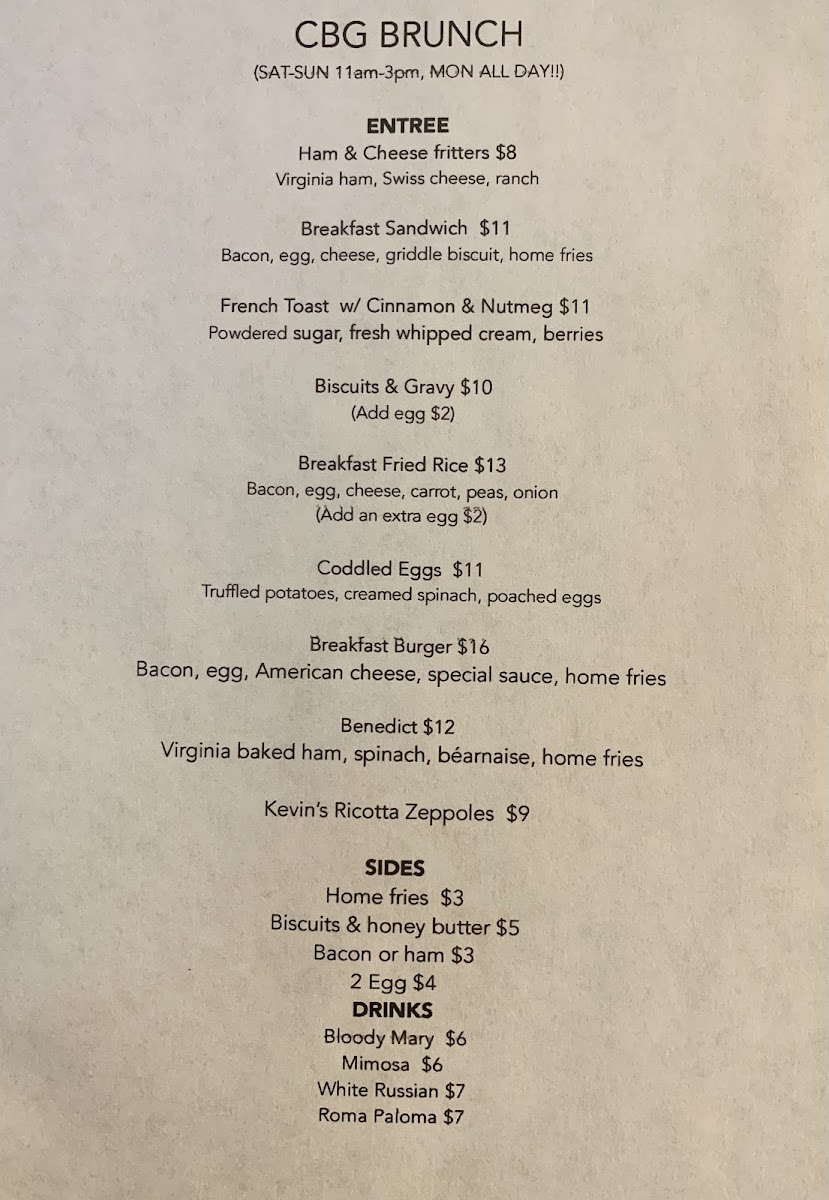 CBG’s menu suits a variety of moments — from midday catch-ups and brunches to after-work gatherings or weekend downtime. The food, with its mix of hearty and fresh elements, fits seamlessly alongside the friendly service and casual, comfortable vibe you’ll find here.